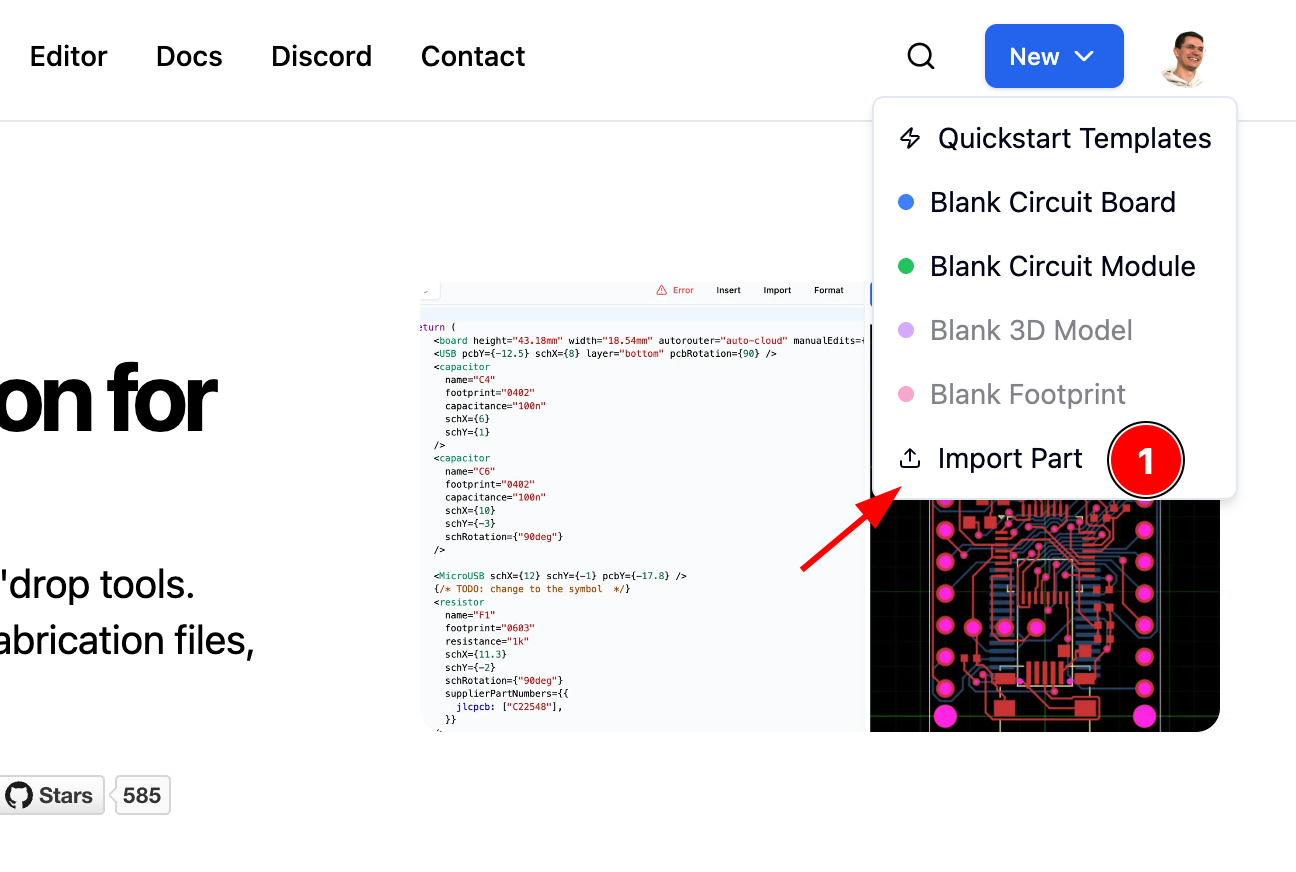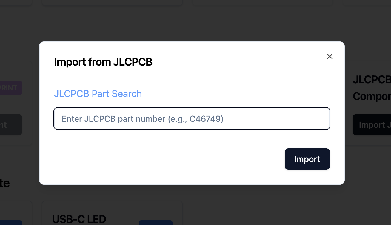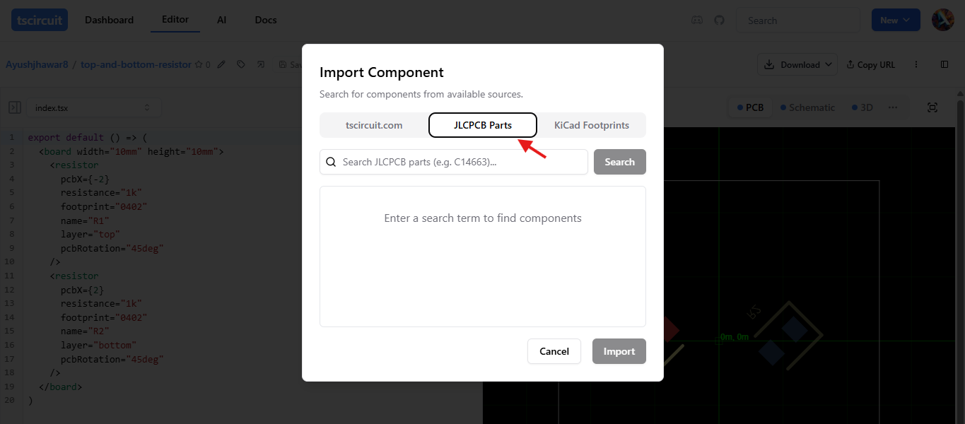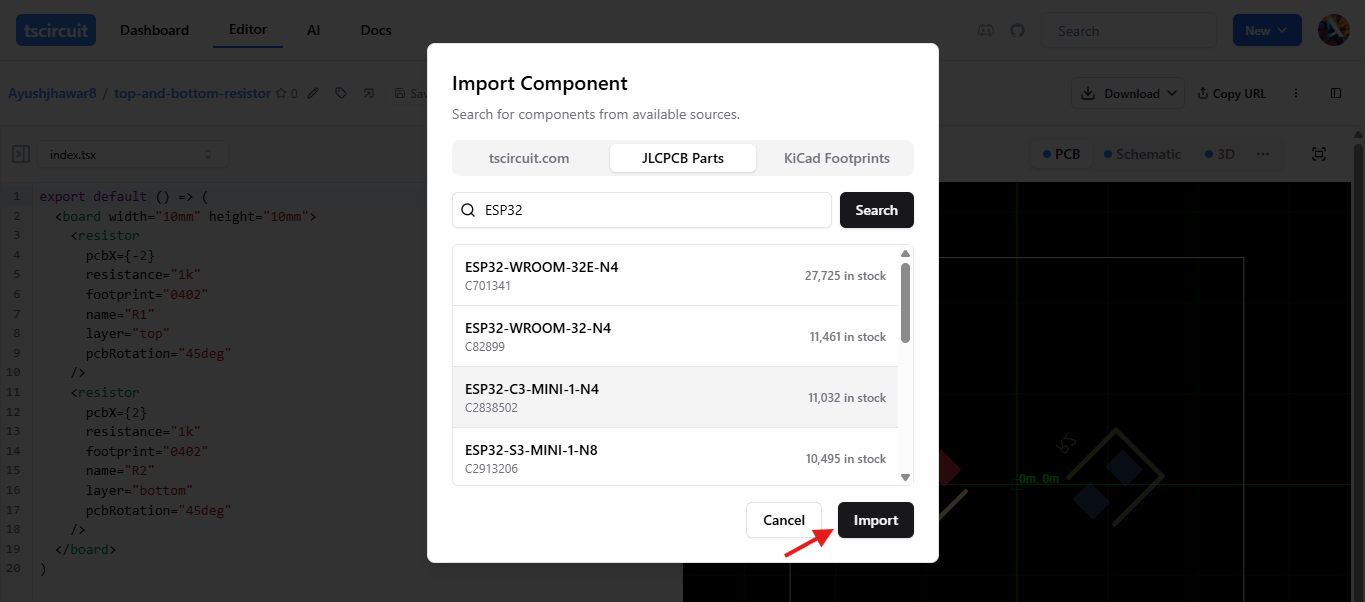 The easiest way to import JLCPCB components is through the editor's built-in import dialog. This provides a modern search interface with real-time stock information and instant component preview.